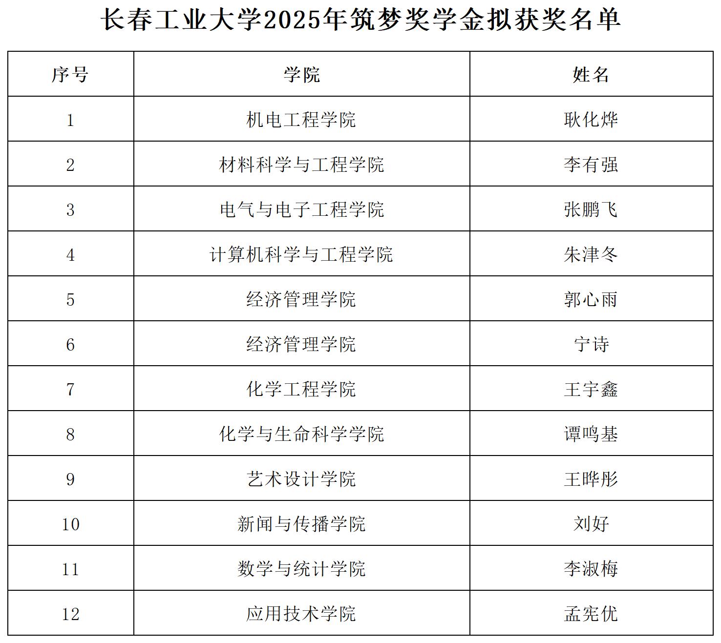 按照《关于组织开展2025年度吉林省筑梦奖学金评选工作的通知》要求,经学生本人申请,学院推荐,学校筑梦奖学金评审委员会评审,拟定2025年筑梦奖学金获得者名单,现予以公示,欢迎全校师生提出宝贵意见,公示期为5个工作日。